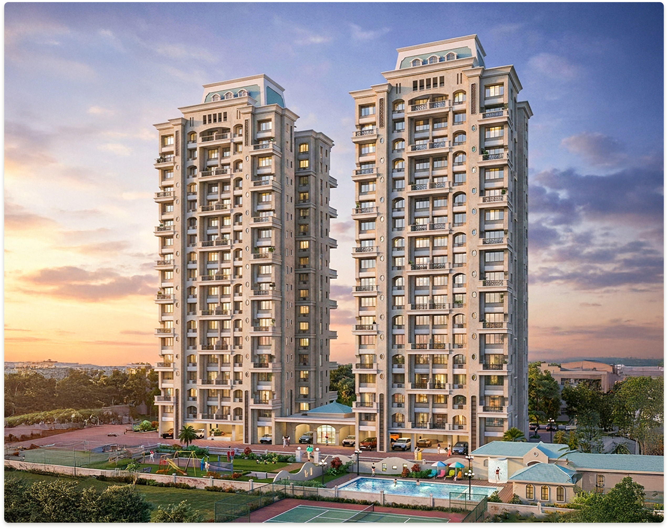 Soaring to an imposing 51 meters above Vashi, this GR + 17 vertical enclave, spanning 1,07,640 sq.ft, epitomizes an erudite fusion of neo-classical grandeur and avant-garde tectonic precision. The twin towers articulate axial symmetry and volumetric hierarchy through pilastered façades, archivolted fenestrations, wrought-iron balustrades, and an emphatic cornice crowned by mansard roofs, culminating in an iconic skyline silhouette. Conceptually, the development envisions a spatial palimpsest where architectural gravitas intersects with